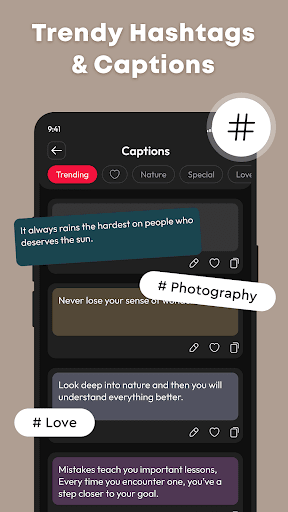 > Gain more likes, followers, and comments on your posts by adding the perfect hashtags and captions to complement your photos!
