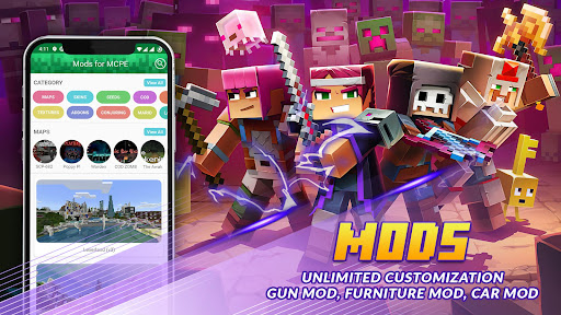 Mods for Minecraft AddOns MCPE is a free utility launcher for MC PE where you will find all the newest mods, skins, and maps for Minecraft.