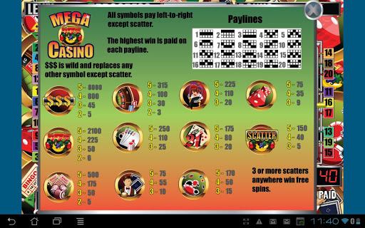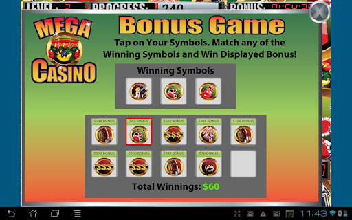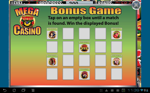 Download and WIn The Jackpot on The Mega Casino Slot Machine!Our slots are voted BEST NEW SLOTS for Android Tablets and Phones!Our latest slot is a "Casino" themed game that features High Definition and High Resolution graphics such as the Bingo, Poker Chips, dice Blackjack, roulette and Triple 7 slot reel symbols.Spin for five"Triple Money" symbols and WIN The Jackpot!The realistic spinning slot reels simulate a real mechanical slot machine with real slot winning percentages that average a 95% payout rate.You can progress through up to 18 levels. At the completion of each level you will be presented with the variety of Bonus Games that you can play with an opportunity to earn FREE coins Check back every 2 hours for a chance to win more Bonus Coins!Match 3 or more "Fruity Scatter" symbols and win 10 free spins!Up to 20 paylines allows you greater chances to win.More Bonus Games will be updated in the game in the coming weeks.The high fidelity sounds of the slot machine make this app a great experience for the slot machine enthusiast.Download the FREE Mega Casino Video Slot Machine Today!