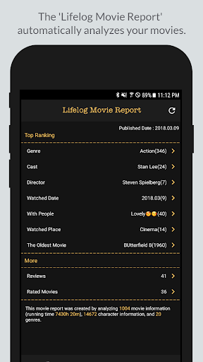 After registering various different movies you've seen, try generating a "Lifelog Movie Report". You can take a look at diverse statistics based on recorded review information and registered movie information.