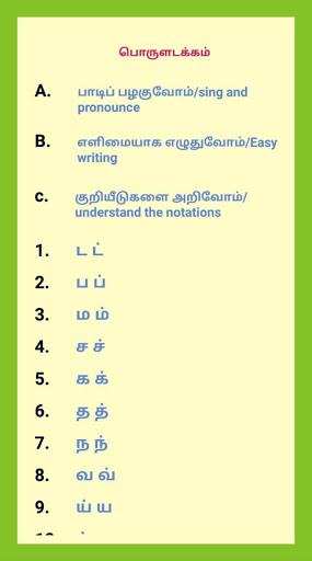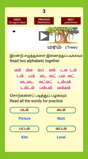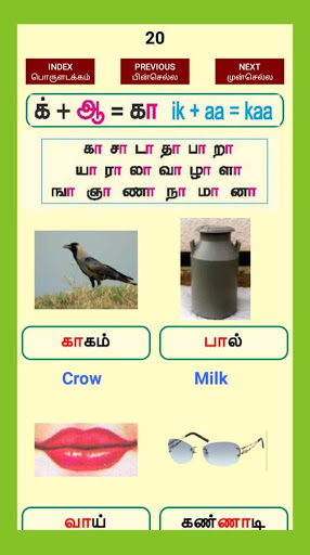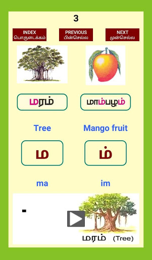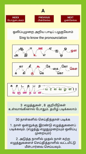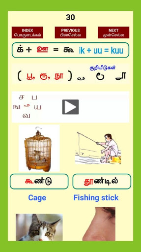 Each alphabet and words used in this app has an audio pronunciation to listen and practice themselves. It also has animated GIFs for each of the Tamil alphabets.