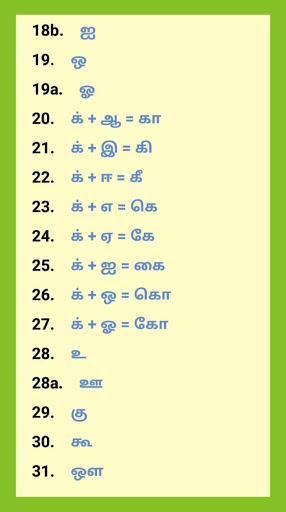 Tamil is a phonetic language and has 12 vowels (Uyir) and 18 consonants (Mei). Compound form of the vowels and consonants is UyirMei which has 216 alphabets. Ayutha alphabet 1. Total 247 alphabets and Grantha alphabets were not included in this app.