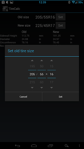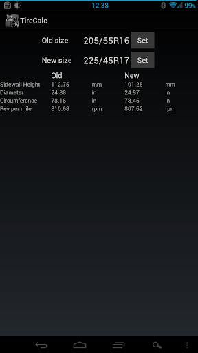 Tire Calculator (TireCalc). --- A tool to compare tire sizes. --- Useful tool to compare tire sizes. Compares two tires' sidewall height, diameter, circumference and revolutions per mile. ICS only.