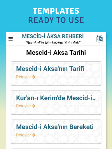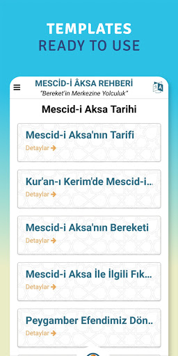 The Masjid-i Aqsa guide, where you can find the most detailed information about the history and current location of the Baytulmaqdis, has been specially designed for you to enjoy this spiritual place at the highest level. This beautiful guide, in which beautiful photos are explained in a clear language, is a must-have application for every Islamic and Jerusalem history enthusiast. Our application does not cause extra RAM consumption and does not create any muscle.