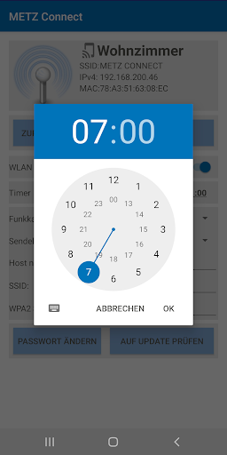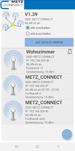 Depois de se conectar à fonte de alimentação, os dispositivos constroem a rede WLAN Metz_Connect. Depois de fazer login nessa rede, todos os pontos de acesso disponíveis são encontrados e exibidos.