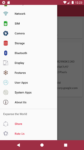 Processor, CPU, RAM, Storage, Camera, Battery, Network, WiFi, SIM, Bluetooth, Display, Screen resolution, GPS, NFC, USB, Sensor, Microphone, Root, Bootloader, CDMA, GSM, Fingerprint, VOIP, Audio & Video Support info, Camera Scene Modes, Camera frame & Resolution, orientation, Bloatware, Default apps, System app, User installed apps, Mac address, SSID, Link speed, IP address, OTG device info, Battery voltage, Battery health, Battery type, OS version, Board, Manufacturer, Model number