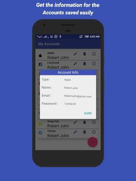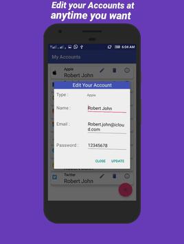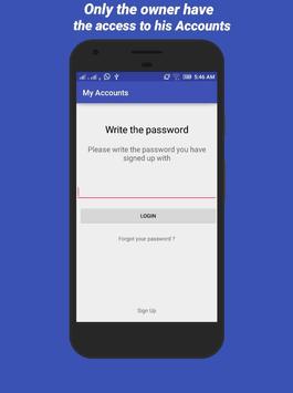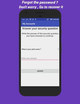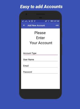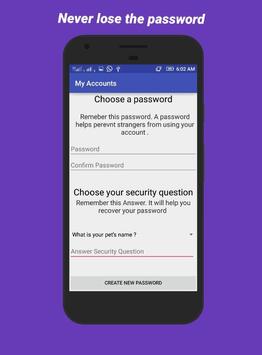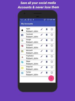 This Application made for android Smart Phone to let the user remember his “Social Media Accounts” and not to lose them . Sometimes there is an important File on your page or email and you are not remembering the password , This Application is for saving your “Social Media Accounts” enter your details and save them and go to find it with its “Username”.