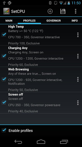 Automate SetCPU with profiles! SetCPU allows you to set up powerful profiles to change your settings under certain conditions, such as what app is running, when the phone is asleep or charging, when the battery level drops below a certain point, when the phone's temperature is too high, or during certain times of day. See the screenshots for examples of how you might set up profiles.