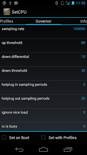 Start at boot: SetCPU will start a profiles service at boot, if enabled. It also sets default boot settings, if enabled. SetCPU does not run in the background if profiles are not enabled, and becomes inactive after settings, if any, are applied.