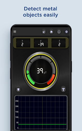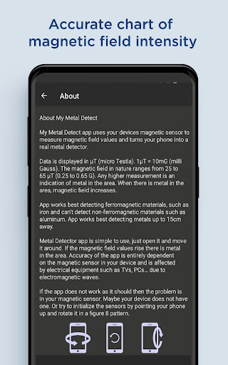 Metal Detector for Android measures magnetic fields with an embedded magnetic sensor. The magnetic field level (EMF) in nature is about 49μT(micro tesla) or 490mG(milli gauss); 1μT = 10mG. When any metal(steel, iron) is near, magnetic field level will increase.