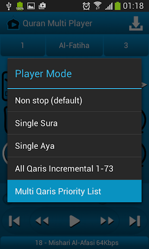 Player Modes (Non Stop, Single Sura, Single Aya, All Qaris Incremental, Multi Qaris Priority List)