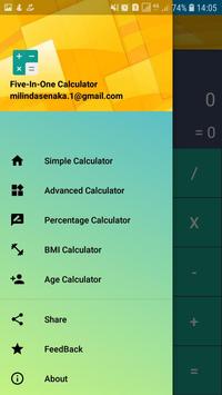 The Five-In-One Calculator for Android. It's a FREE, complete and easy to use. Designed with simplicity in mind, it helps you solve problems. It includes a Simple Calculator, Advanced Calculator, Percentage Calculator, BMI Calculator, and Age Calculator.