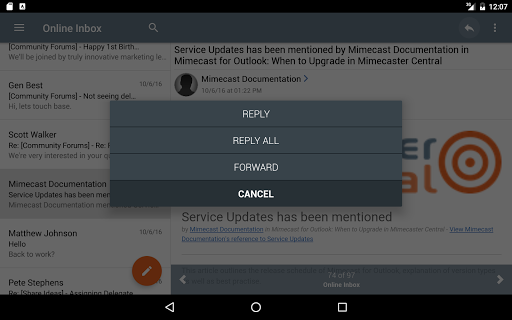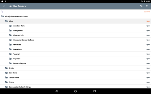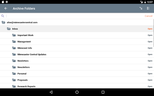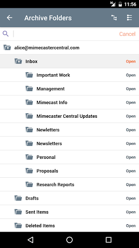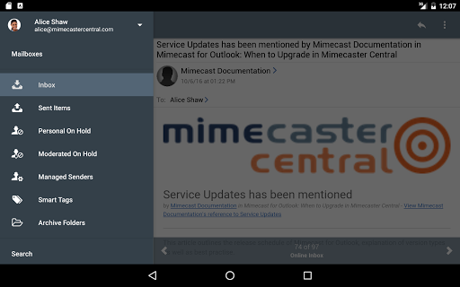This app allows you to access Mimecast’s Cloud Services from your Android device. If your organization uses Mimecast Services for email security, email archiving or email continuity, this app provides seamless access to key services including the ability to: