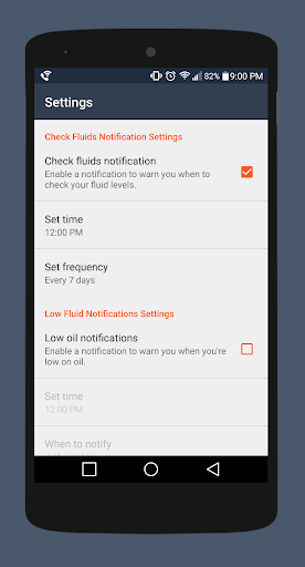 Use the notification reminders to remind you to check your fluids or to alert you when your vehicle is low on oil or coolant.