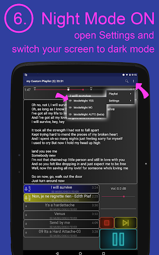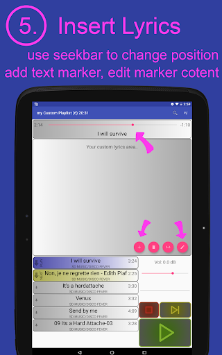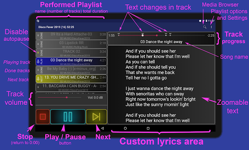 Every track you have in your device, you can assign one or more text changes for it, so the StageBaxx will always show you the right lyrics during your performance. Just copy your backing track audio files in your android device inernal storage or even SD card, and assign new propeties for them. This player is complete offline solution for your gig.