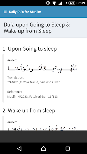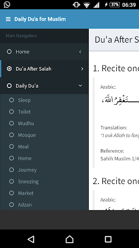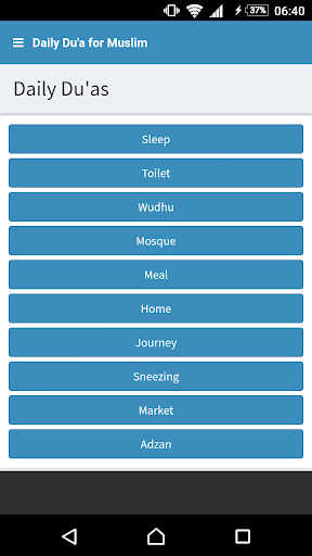 Daily Du'a for Muslim offline version. * Du'a After Salah * Daily Du'a: - Sleep - Toilet - Wudhu - Mosque - Meal - Home - Journey - Sneezing - Market - Adzan