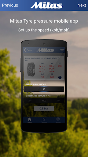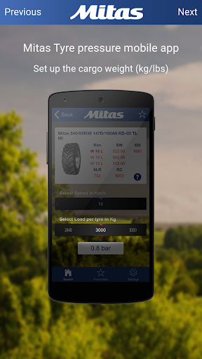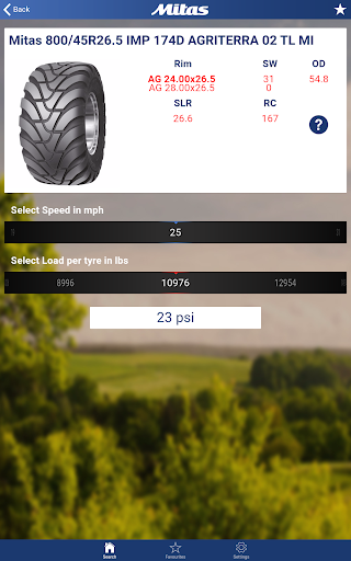 Just simply find your tyre in the Mitas agricultural tyres database using full-text search or filtering by tyre size. Then add your tyre to Favourites for an easy access to the right tyre pressure in different working conditions.