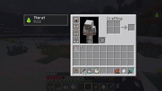 This mod adds a bunch of new items, armor, drinks, potions and more. This mod adds realism to Minecraft, creating a thirst and temperature system. Realistic Minecraft. Real life Minecraft mod. Thirst is similar to hunger.It is spent while running, besides, you will not be able to run if the thirst is equal to or below 3. Also on complexity "difficult" and "hardcore" you can die from dehydration. You can quench your thirst in a variety of ways, from leather jars to a variety of drinks.