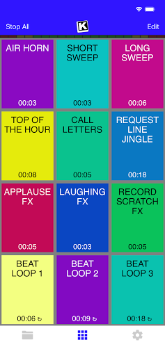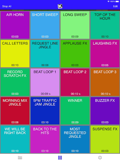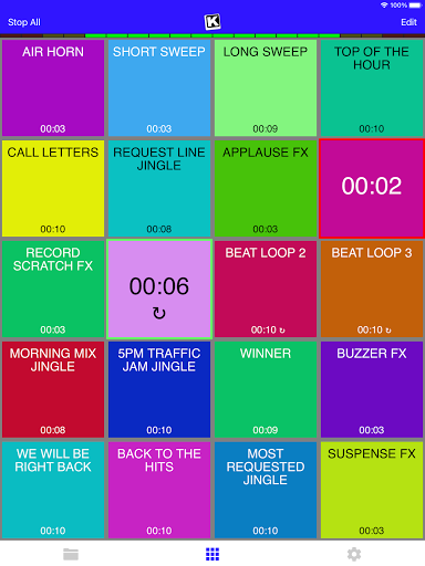 KueIt Mobile gives you the flexibility you need. Load up to 20 audio tracks per profile and customize your layout. Trigger your drops, jingles, sound effects and songs instantly with the touch of your fingertips.