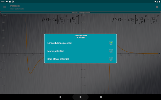 - Possibility to select and visualize selected potential. Currently, three common potentials are available: Lennard-Jones, Morse and Born-Mayer.