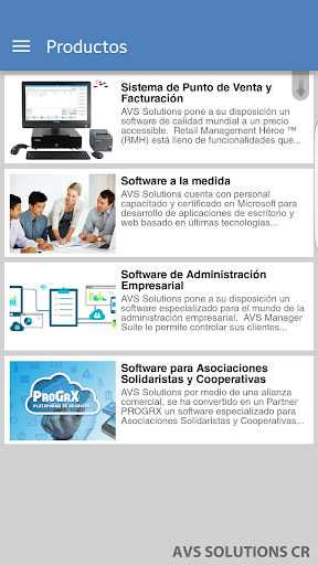 Esta App le permitirá conocer las diferentes herramientas de software que podrán generarle productividad en su empresa. Sistemas de Punto de venta como Retail Management Hero, sistema de contabilidad, sistema de gestión para Asociaciones Solidaristas, Aplicaciones mobiles para sus clientes y mucho más.