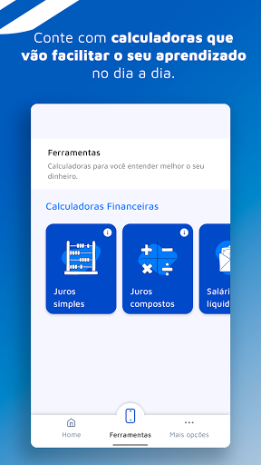 O MobillsEdu conta também com uma área de ferramentas que trazem calculadoras para te ajudar ainda mais na gestão de finanças. As calculadoras de juros simples e compostos vão facilitar o entendimento desses cálculos. A calculadora de salário líquido mostra em detalhes todo o cálculo do salário em regime de CLT, descontando todos os impostos trabalhistas que incidem sobre o salário.
