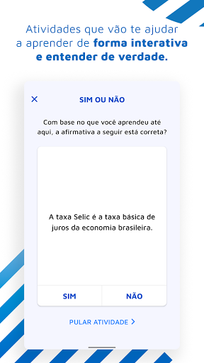Fazendo o que sabemos de melhor, construímos uma experiência completa sobre educação financeira em que você aprende com lições de até 5 minutos, que trazem diversas atividades interativas para que você possa fixar o conteúdo de maneira lúdica. Além disso, todas as lições trazem exemplos práticos para o dia a dia, então você vai entender de vez como todas aquelas siglas e conceitos de finanças, que pareciam complicados, impactam na sua vida financeira.