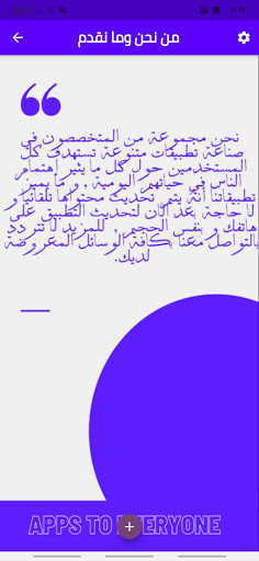 Through the application, you can access a free application store for Android to browse the various modern applications that we offer in order to enrich the Arabic content on the Internet, and what distinguishes these applications is that they are programmed with high professionalism and their topics are from the users' options and from what tops the search indicators on the Internet, and is characterized by automatic updating without The need to reinstall the app from your cell phone, and the general app content is added periodically.