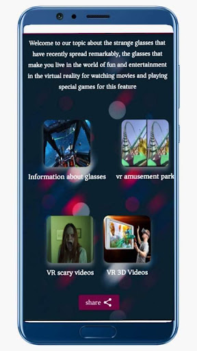 Virtual reality glasses to display virtual reality videos and display 3 d videos About the virtual reality glasses application, you can watch the most beautiful virtual reality videos, and inside the virtual reality application there is information about virtual reality glasses Through virtual reality glasses, you can pass the time and enjoy it. The application also contains renewed content, through the application you can view applications with the virtual reality box feature