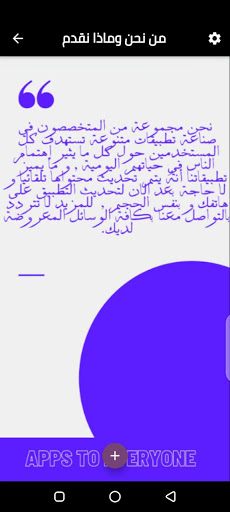 Through the application, you can access a free application store for Android to browse the various modern applications that we offer in order to enrich the Arabic content on the Internet, and what distinguishes these applications is that they are programmed with high professionalism and their topics are from the users' options and from what tops the search indicators on the Internet, and is characterized by updating