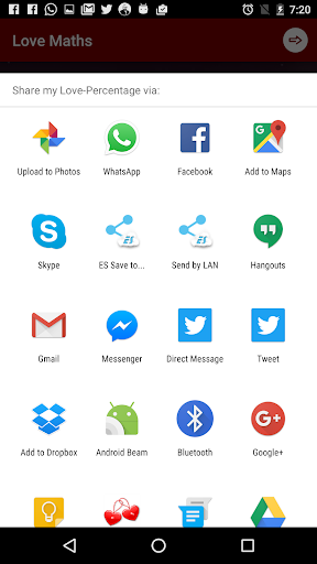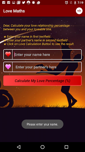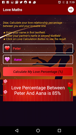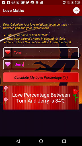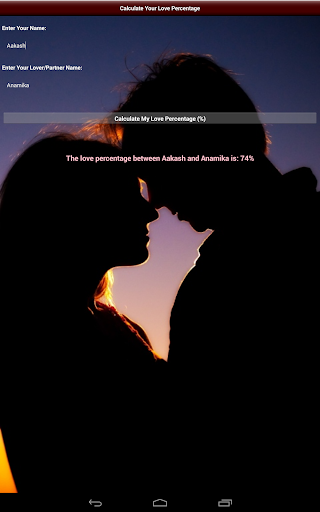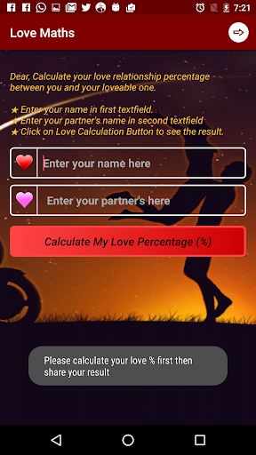 Good to calculate love calculation between two lovers. Happy with this new version 2.0. Now I can share my love percentage on Facebook and WhatsApp also....