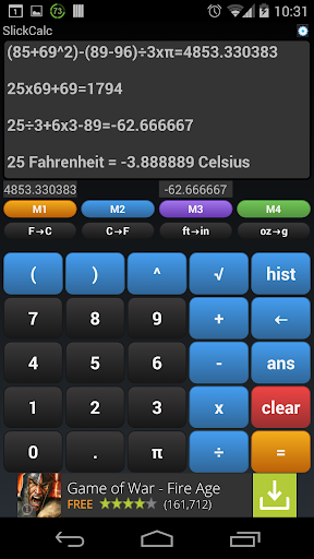 * SlickCalc calculator has 4 user configurable unit conversion buttons for one click unit conversion.