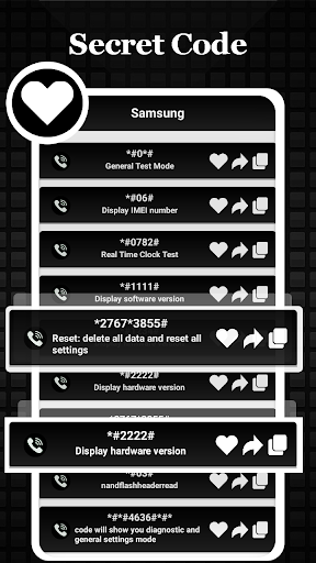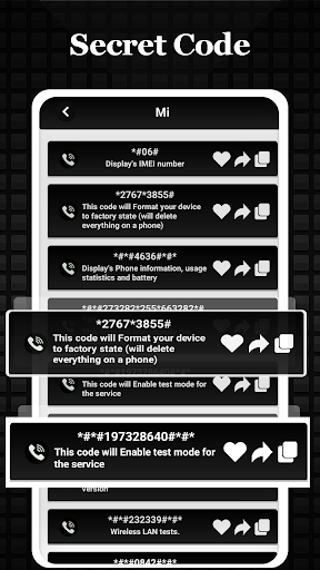 Reset Mobile Device, Engineering mode, Network test, WLAN test, and lots more of codes available.