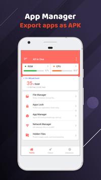 App Manager, Junk Cleaner, Speed Booster, Memory Optimizer, Battery Optimizer, AppLock, Network Manager, Anti Theft Alarm, Flashlight, Compass