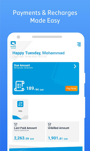 Mobily Business application provides you the ability to view your activated services through user friendly dashboards, in addition to managing your billings and payments, through:
