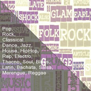 You can listen to any music category : Pop, Rock, Dance, Jazz, House, Hip Hop, Rap, Electro, Thecno, Soul, Blues, Latin, Bachata,