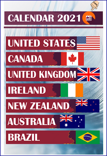 You can see the 2021 calendar and the holidays of the United States, Canada, Ireland, New Zealand, United Kingdom, Brazil, Australia and China in a simple way to use, by simply clicking on the box marked on the day of each month, you will see the holiday destined for each country.