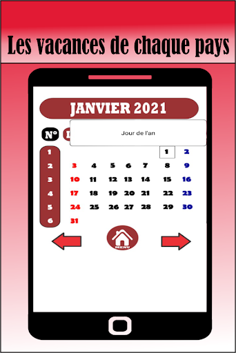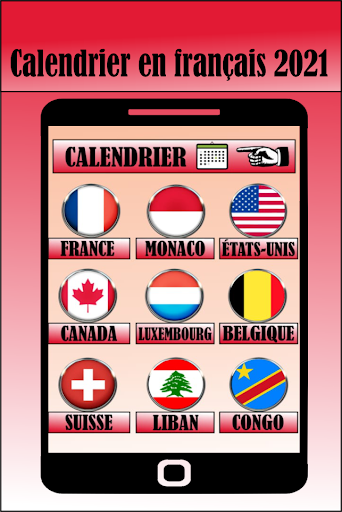 Easy to use calendar with holidays and where you can see all holidays in 9 French-speaking countries, such as: United States, Canada, France, Monaco, Belgium, Luxembourg, Switzerland, Congo and Lebanon.