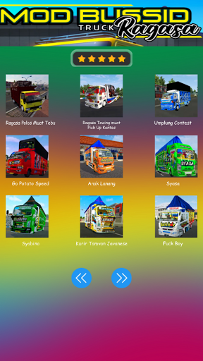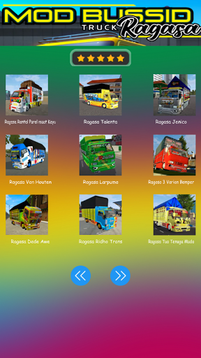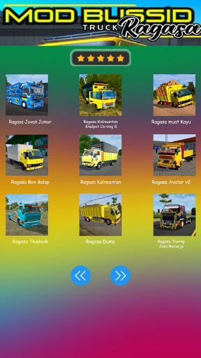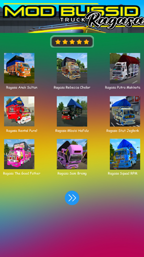 Vari tipi di camion mod Ragasa, tra cui: MoD Ragasa camion Avatar, Mod Ragasa Chelore, Autocarro con cassone ribaltabile mod, Mod Bussid Truck Bussid Ragasa Escavatore Escavatore Auto Forza, Mobil Ragasa Truck Wood, Mod Camion Tarpaulin Box, Mod Camion Ragasa MBOIS, mod Bussid Ragasa King's Crown, Camion di Ragasa standard mod, così come Ragasa Balak Mod.