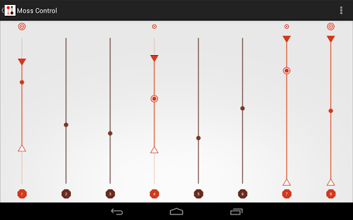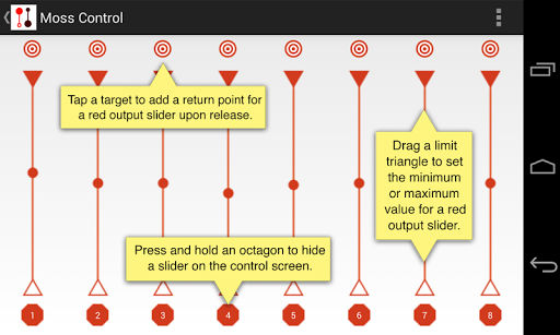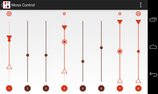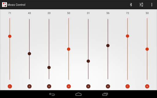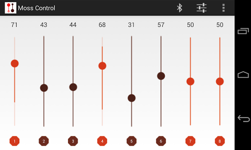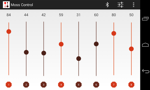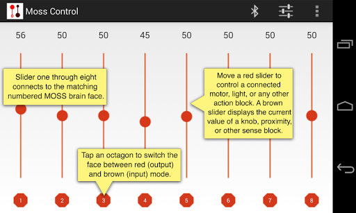 MOSS Control is a two-way remote control app. It has eight sliders; one for each face on the Bluetooth MOSS module. Set some to output and remote control your robot! Set some to input and watch your robot's sensor values change in real time on your mobile device.