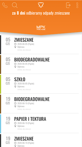 Pełny terminarz wywozu śmieci w danej okolicy – aplikacja działa na obszarze w którym usługi wywozu śmieci świadczy firma MPK Pure Home. Za pośrednictwem software’u każdy mieszkaniec będzie miał wgląd w przyszłe wydarzenia związane z odbiorem nieczystości. Daty zawarte w oprogramowaniu są tożsame z tymi, które można znaleźć w jego papierowym odpowiedniku. Dodatkowo każda z nich opatrzona została ikoną worka w kolorze zbieżnym z wymaganiami Ustawodawcy.