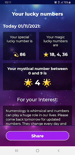 • Lucky numbers: According to Numerology, each of us has our number, which identifies us and defines our way of being, just like a horoscope. Get your daily lucky numbers.