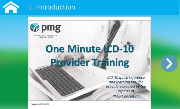 The One Minute ICD-10 Provider Training app from PMG is a handy, quick guide to the new ICD-10 coding standards relevant for your health center. Periodically updated content guides the user through the critical elements of proper coding with the new ICD-10 standards.