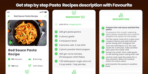 The app All Pasta Recipes Offline in English has many good features - like works in offline mode, the recipes can be easily bookmarked by using the favorite option, multiple sharing options, facility to search a particular recipe from all recipe tasty vegetarian recipes tasty non-vegetarian.