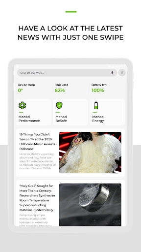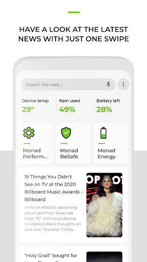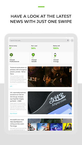 Swipe left and you'll see the most relevant information you need to know in a completely new, easy-to-read environment. Easily scroll through the most recent news, view the weather, search the web, or simply optimize your device through our quick access shortcuts.