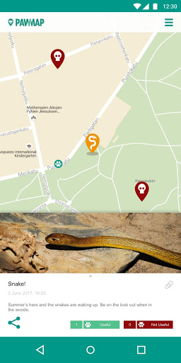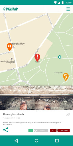 This easy-to-use application allows you to place different markers on the map. The markers notify other dog owners of a fun place to visit with your dog, or possible danger nearby. You can also view and check the markers other users have placed on the map.