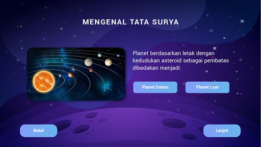 Program ini digunakan sebagai alat bantu pengajaran materi Tata Surya dengan model Augmented Reality. Program ini memuat konten pembelajaran tata surya yang dapat digunakan oleh peserta didik untuk memahami konsep tata surya dengan lebih menarik dan menyenangkan. Dengan aplikasi Augmented Reality peserta didik dapat belajar sambil bermain sehingga mendapatkan informasi yang lebih nyata. Pembelajaran dengan memanfaatkan aplilkasi ini diharapkan dapat menambah persepsi dan pengetahuan tentang tata surya. Aplikasi ini berisi tentang anggota tata Surya, klasifikasi tata surya dan karakteristik tata surya