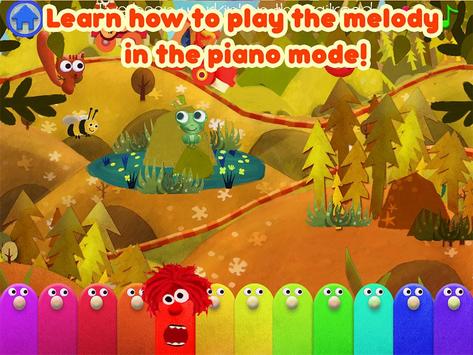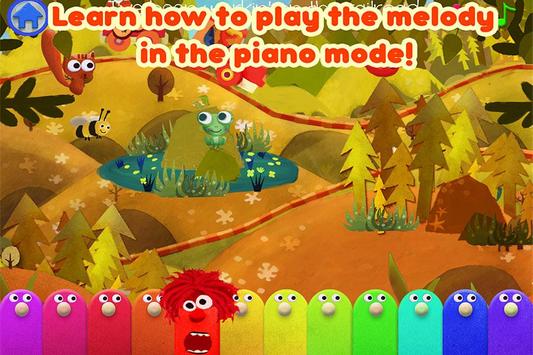 Kid Song Planet also contains a special learning-feature aimed at encouraging musical development. This feature encourages your child to play the melody together with the song, it is designed to be easy to learn and play: Simply tap the notes when they become red to play the melody !