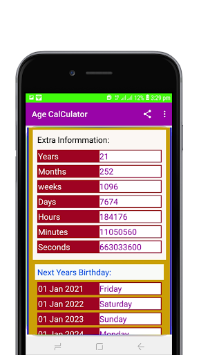 এই অ্যাপের মাধ্যমে আপনি আজকের দিন ও জন্মদিন কিংবা যে কোন দুটি দিন এর মধ্যের পার্থক্য নিখুঁত ভাবে ক্যালকুলেট করে বছর মাস দিন এমনকি সেকেন্ড পর্যন্ত নিখুঁত ভাবে হিসাব পাবেন।