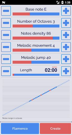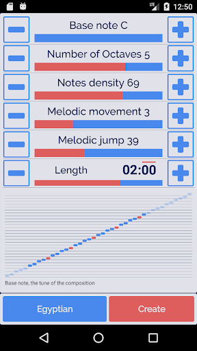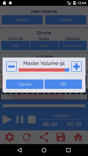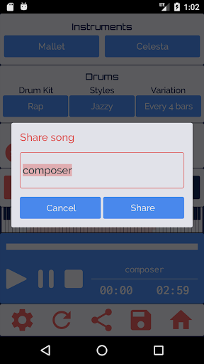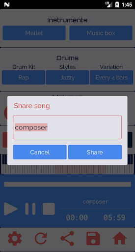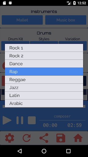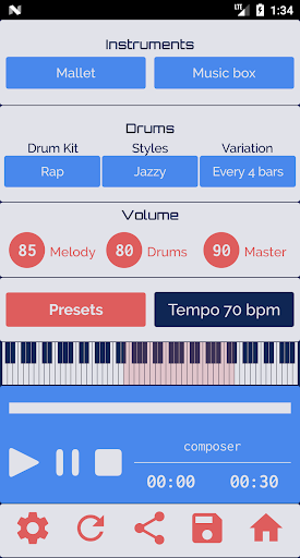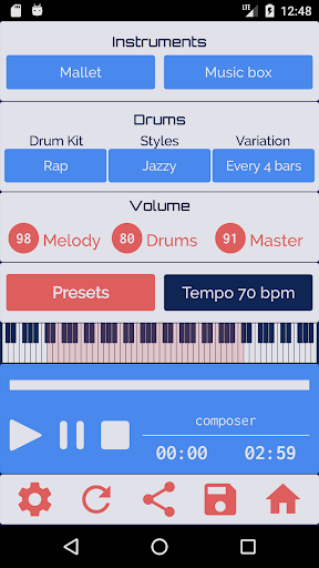 Composer lite creates and composes original music and songs with melodies and drum beats, through random algorithms, up to 2 minutes and 59 seconds length (60 minutes in paid version). Without the need of any musical skill .